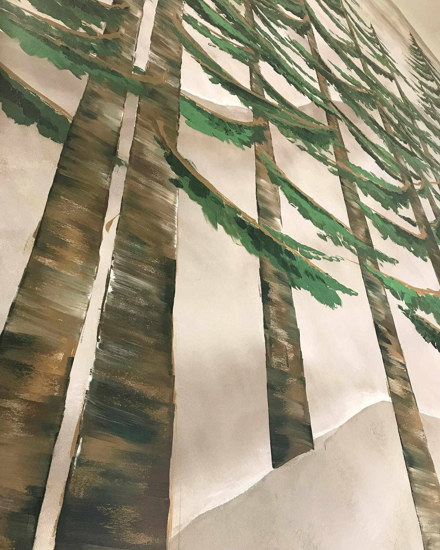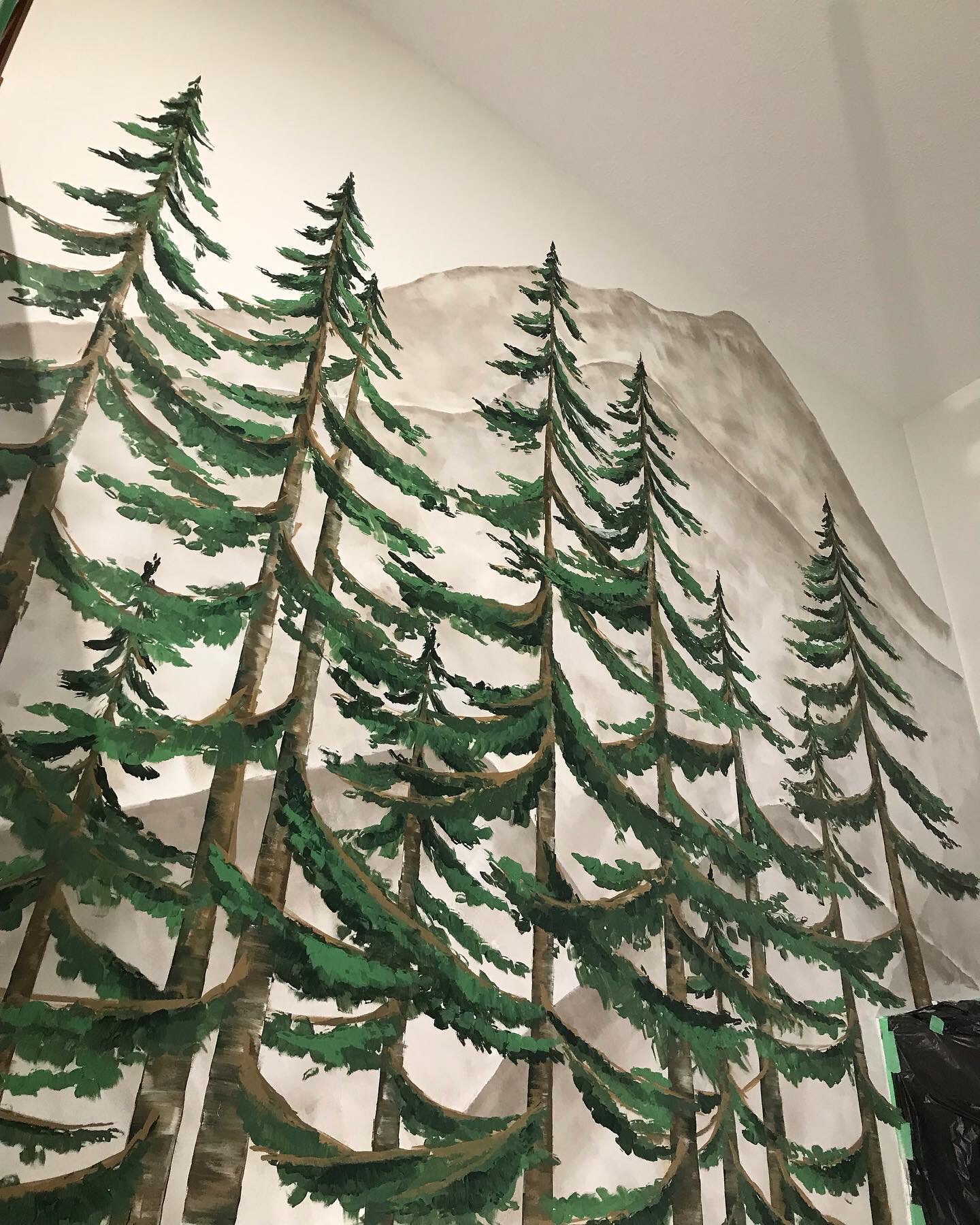 Here is a collage of photos showcasing the final artwork and process of creating the 18ft wall mural: