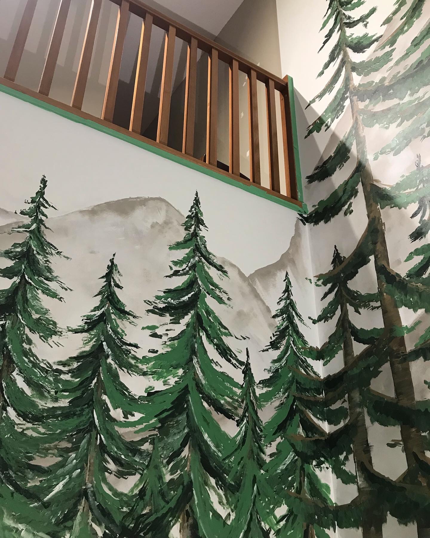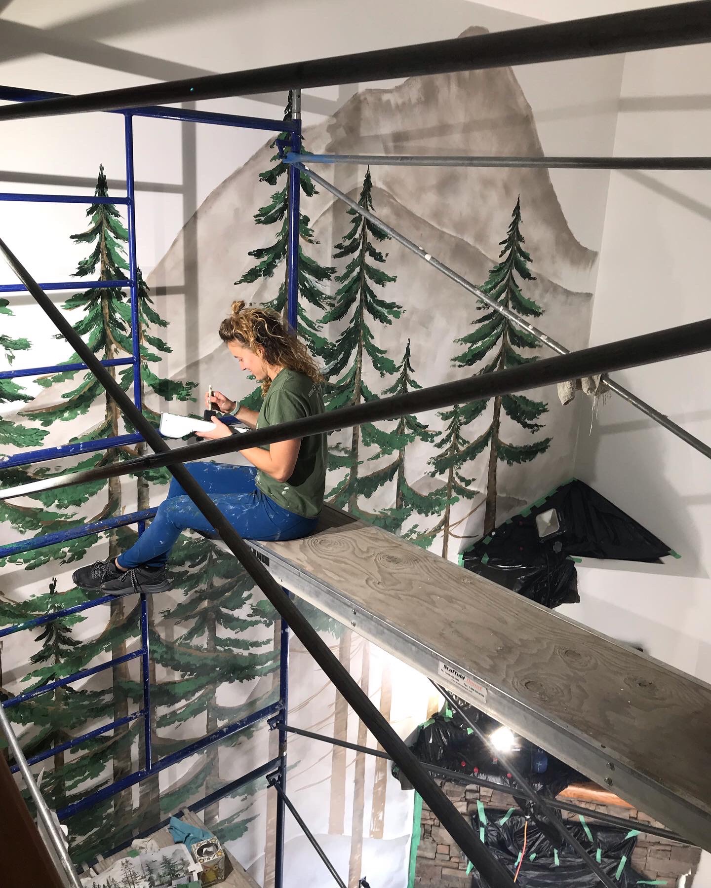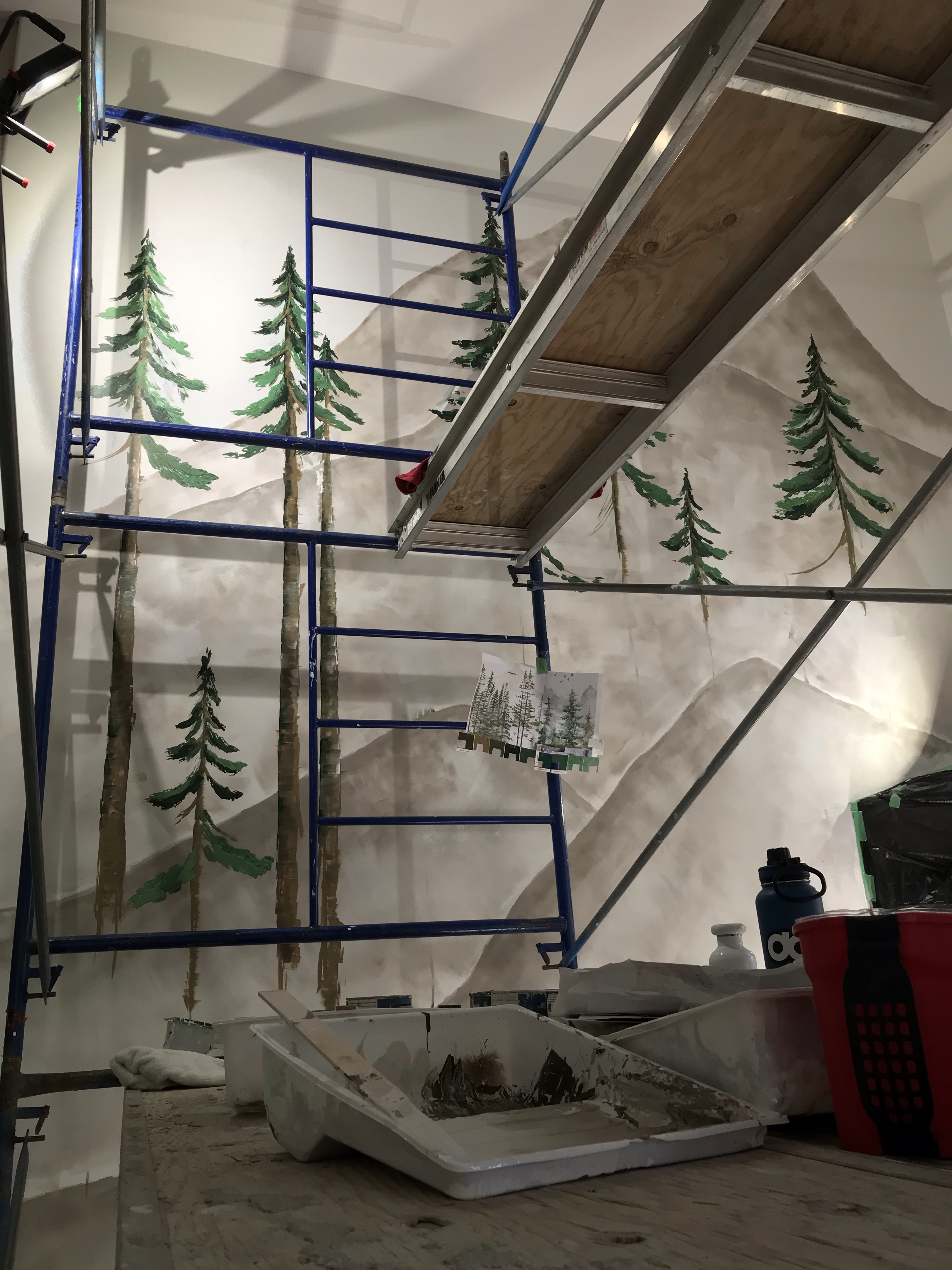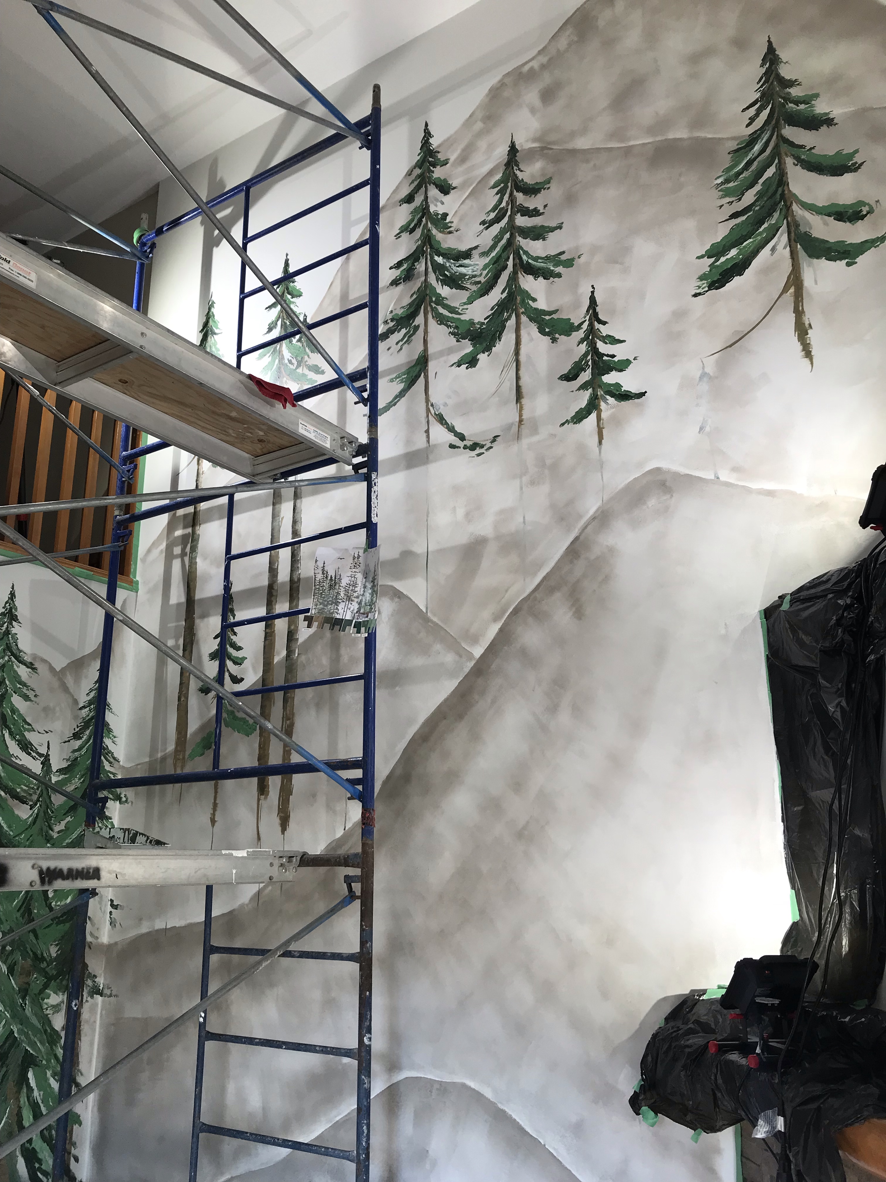 I’m really happy with how my wall mural has turned out for 3 Peaks Rentals! I now have some professional photos to show you. I have already posted about this painting but I feel these photos are worth talking about as they bring it to life and show the scale. The wall was 18ft high and had to be painted using scaffolding. You can see the process I went through in older posts below. I hope you like the pictures!
