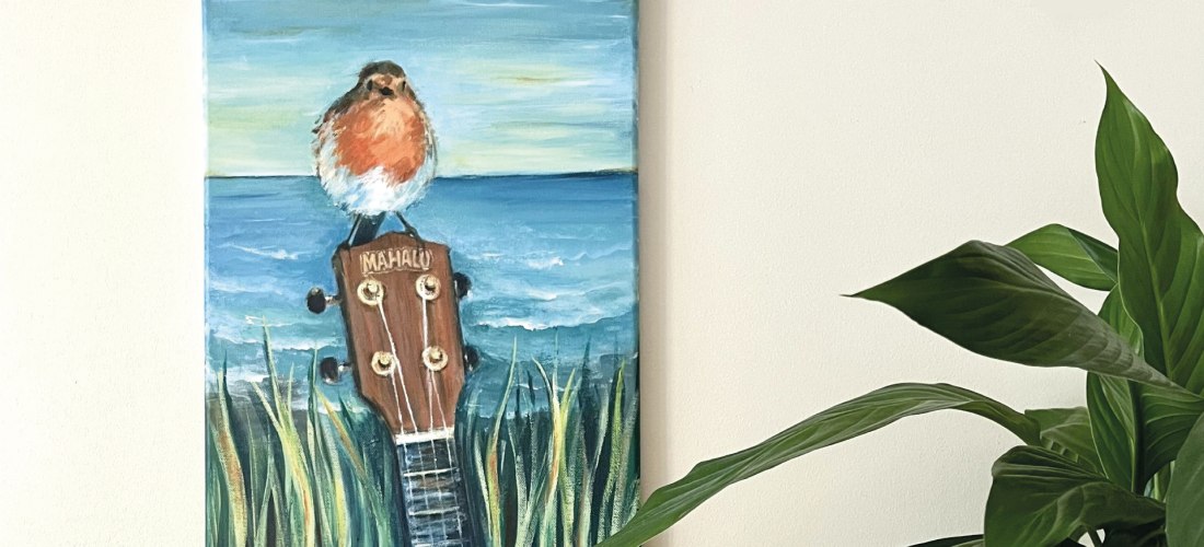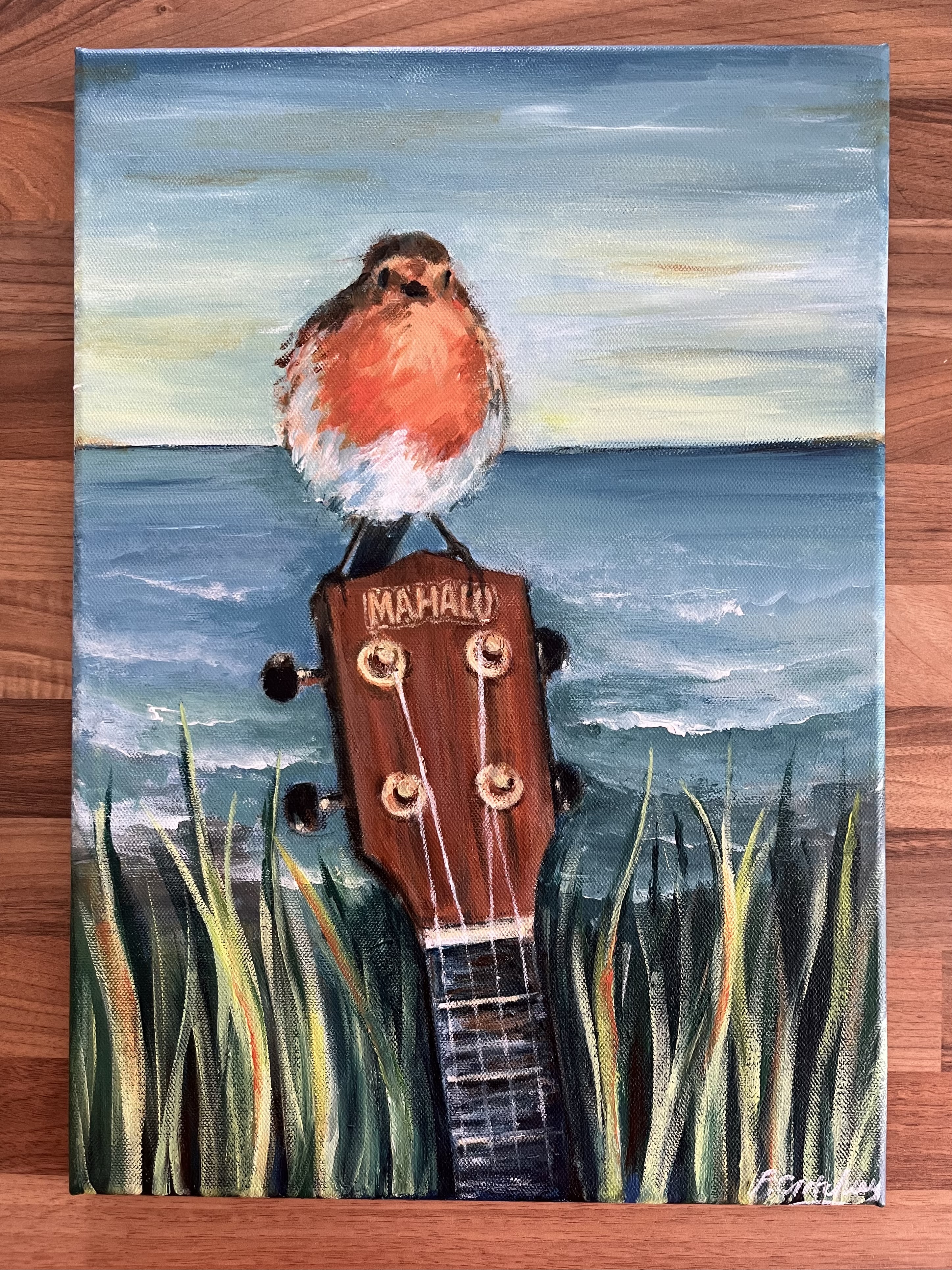 A new painting! This is a commission I was asked to do recently. It pictures a robin sitting on the top of a Ukulele overlooking the sea. A random but wonderful request! It’s the first time I’ve painted a bird and it’s made me want to paint more of them. Birds are magnificent creatures of this planet and I’ve noticed myself becoming more and more fascinated by them. Watch this space as I have been asked to paint something very similar to this by the same customer, and I’ll be starting it soon!